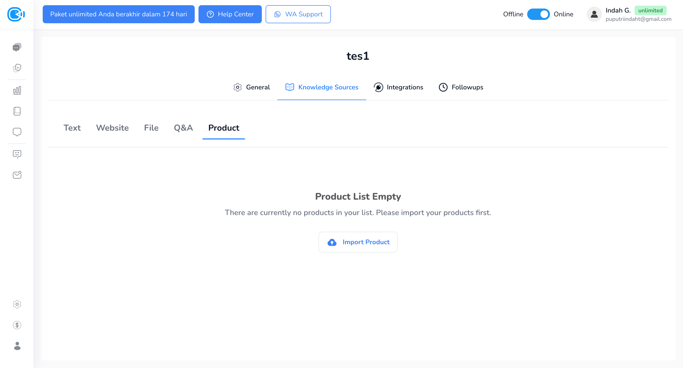 Fitur Product memungkinkan AI mempelajari informasi produk yang sudah Kamu buat di fitur Product. Produk ini perlu di-import terlebih dahulu agar AI dapat mengenali detail produk dan menggunakannya saat menjawab pertanyaan customer.