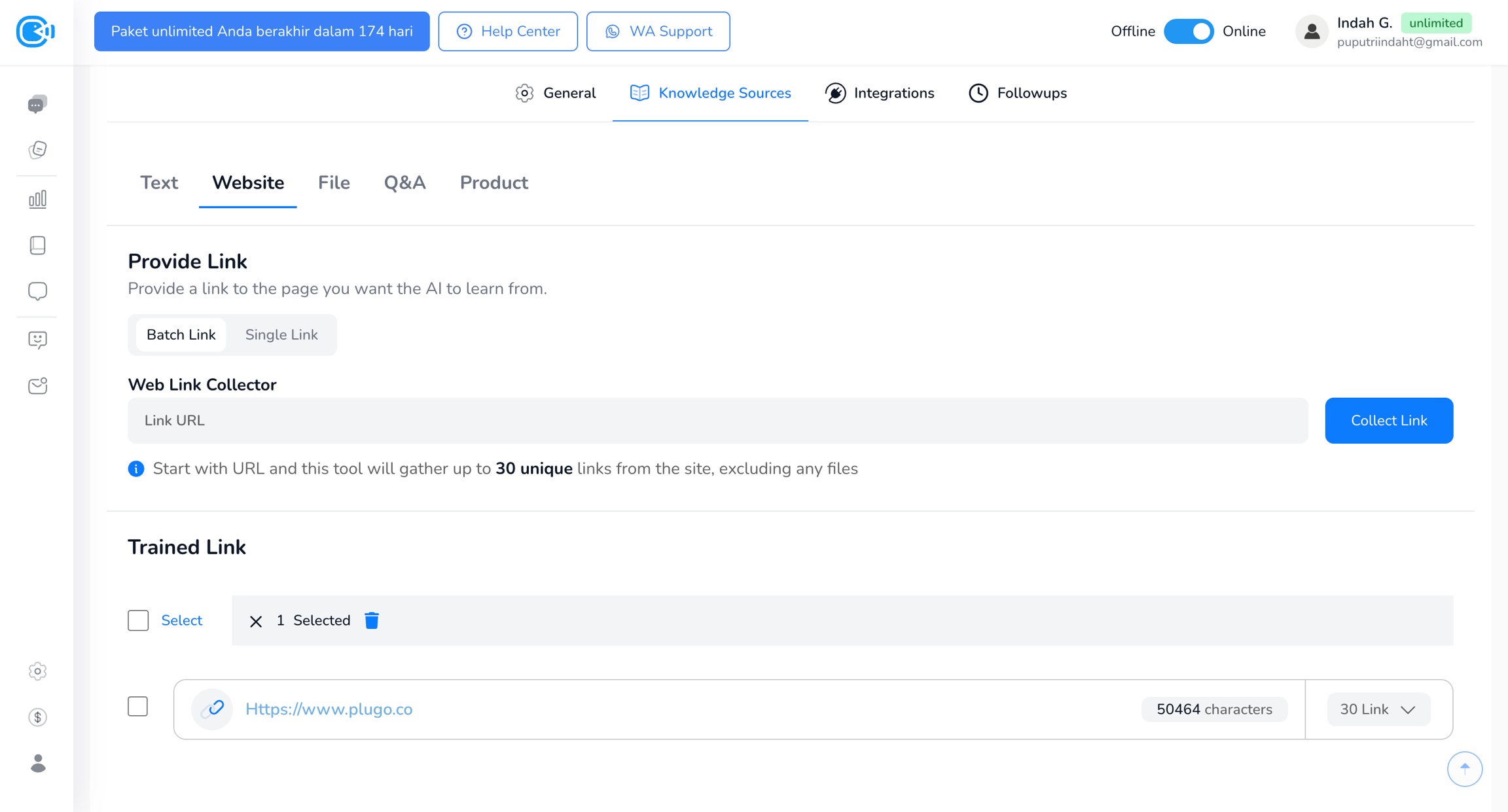 Fitur Website memungkinkan AI melakukan crawling terhadap link yang diberikan. Kamu dapat melakukan crawling untuk satu link tertentu (single link) atau beberapa link sekaligus (batch link). Crawling ini akan mengambil konten dari halaman website dan menjadikannya sumber pelatihan untuk AI.