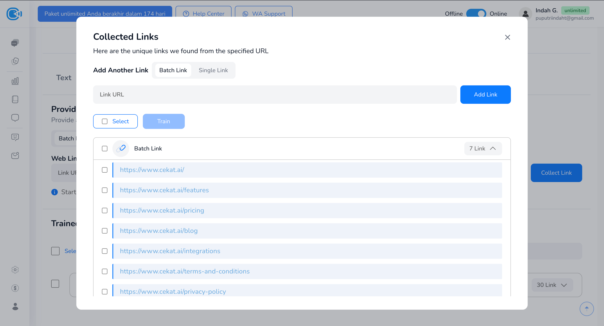 Pop-up akan tertutup, dan link yang sudah di-train akan muncul di daftar bawah halaman.