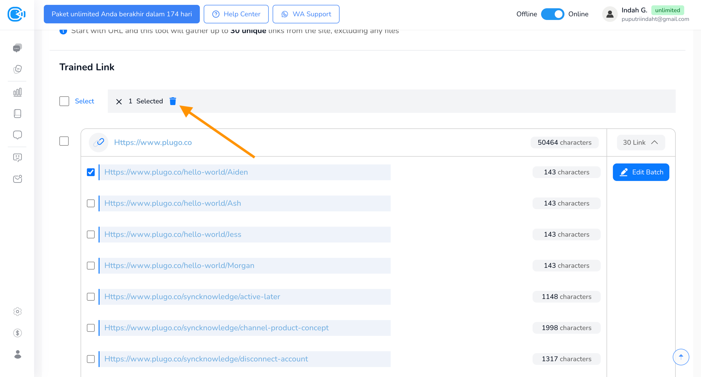 Untuk mengedit, klik tombol Edit di sebelah kanan link yang sudah di-train.