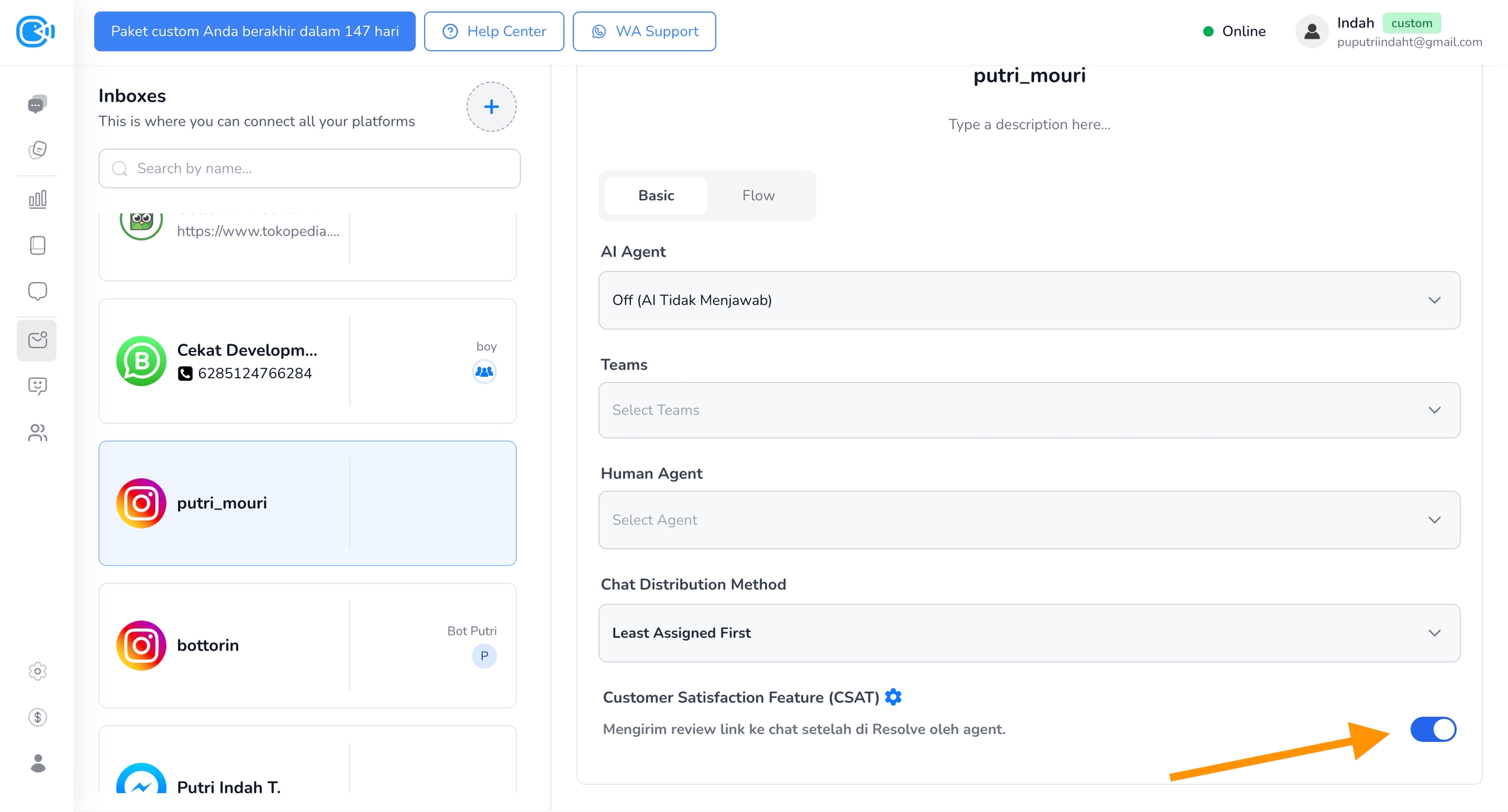 Pilih inbox yang ingin Kamu aktifkan CSAT-nya.