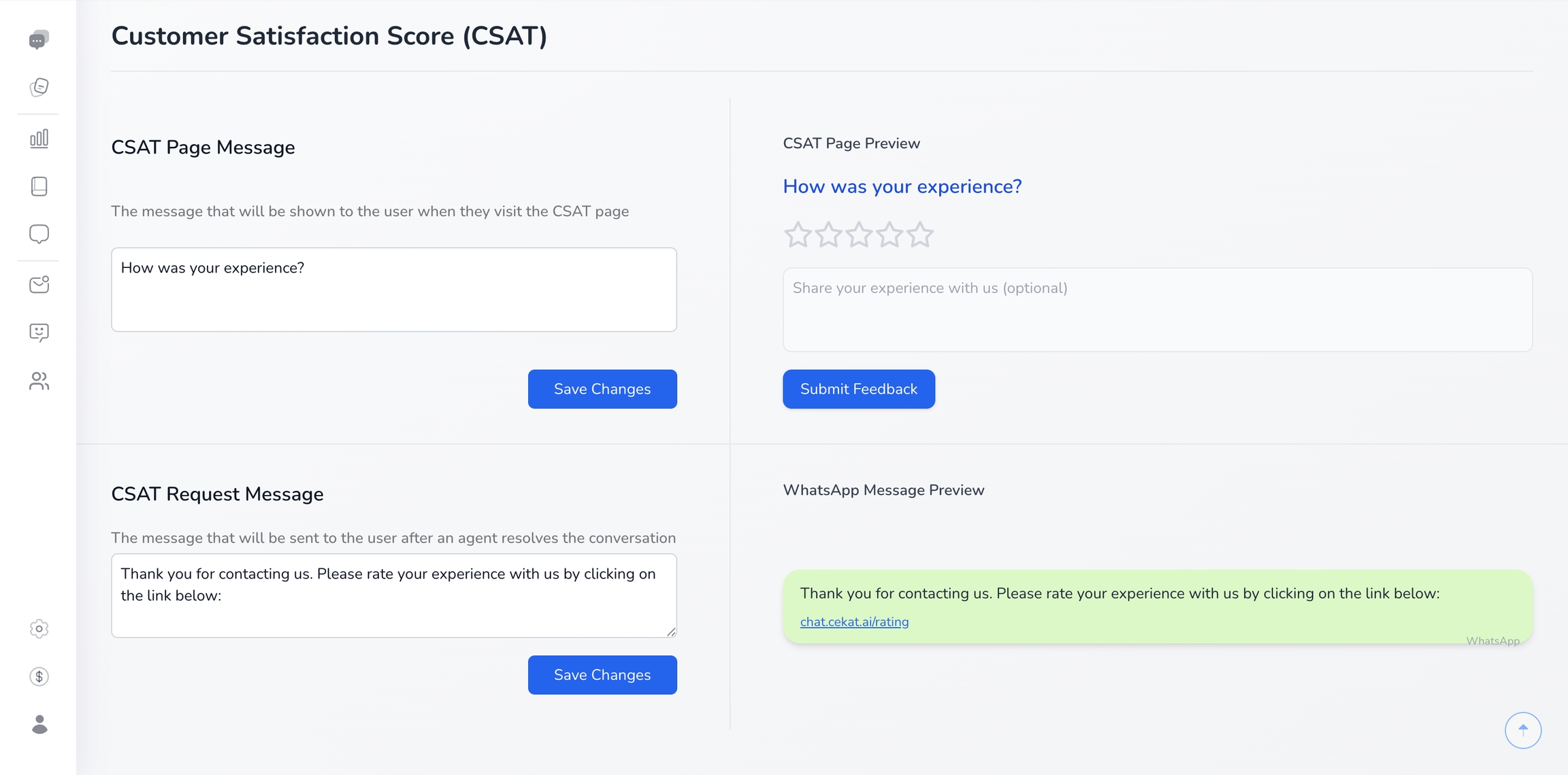 Fitur ini memungkinkan Kamu mengirimkan link review ke customer secara otomatis setelah percakapan diselesaikan (resolve) oleh agent. Dengan mengaktifkan CSAT, Kamu dapat mengumpulkan feedback dari customer dengan lebih mudah.