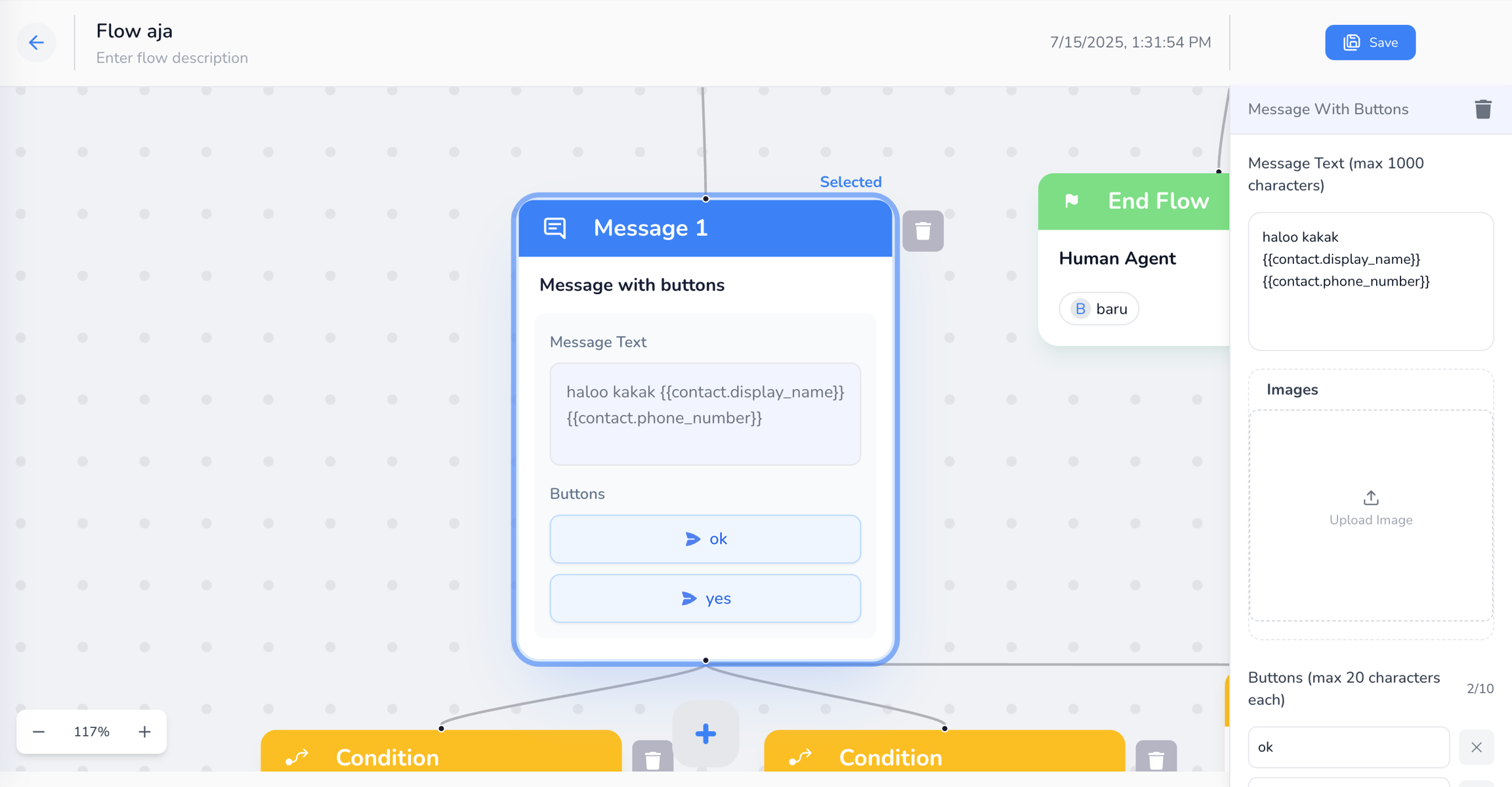 Untuk menampilkan nama atau nomor telepon kontak di pesan otomatis (seperti di Send Message atau Message with Buttons), cukup tambahkan variabel berikut dalam pesan: