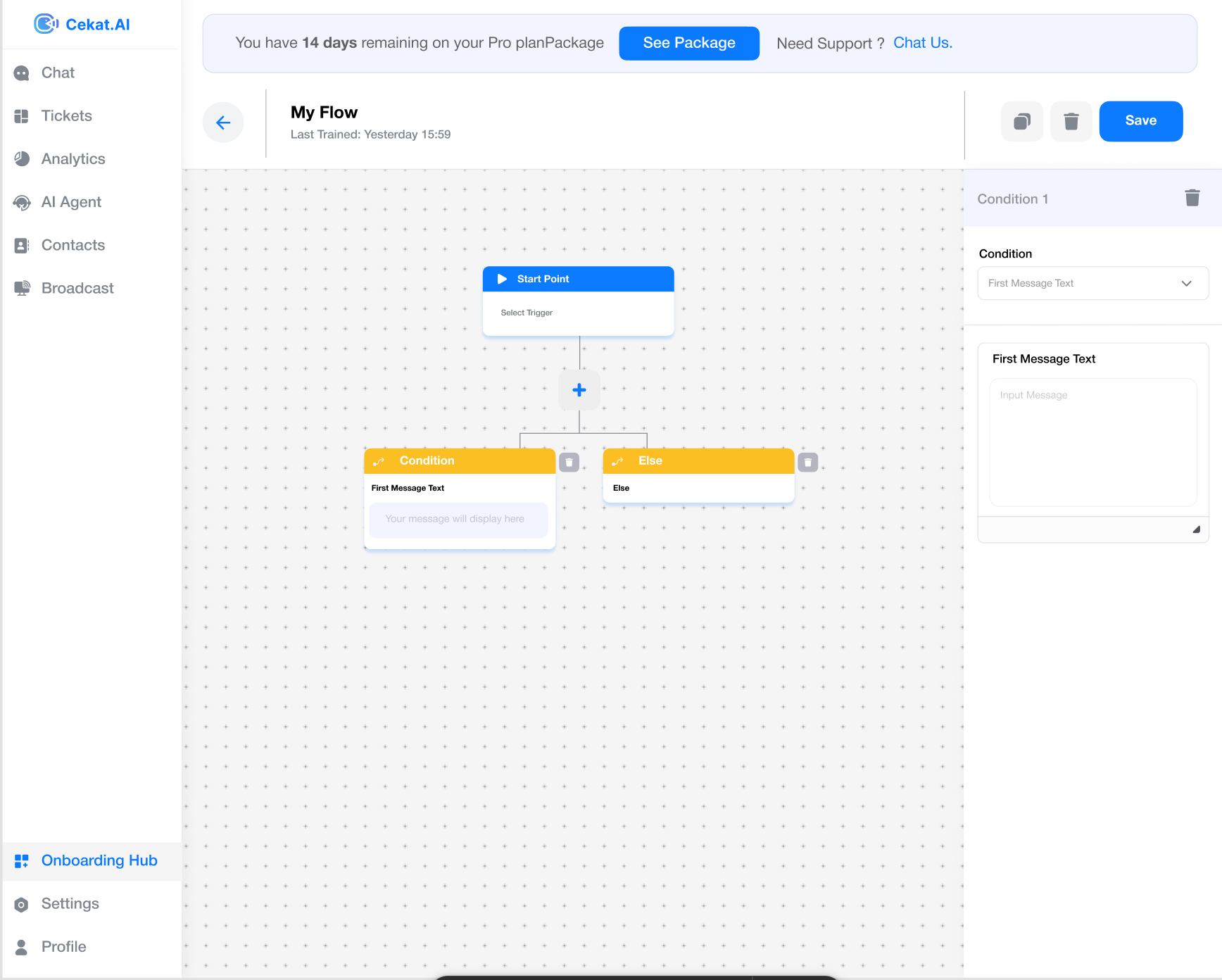 Setelah masuk, akan muncul satu card bernama Start Point sebagai titik awal alur percakapan.