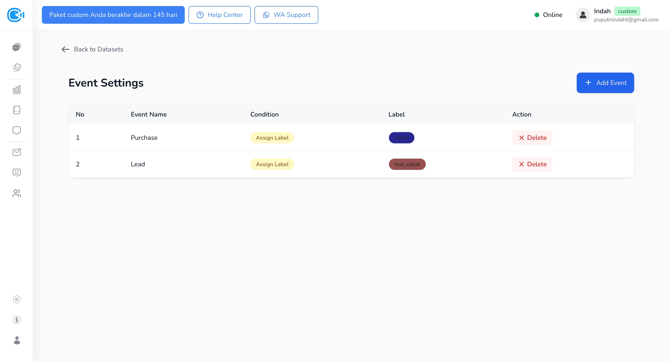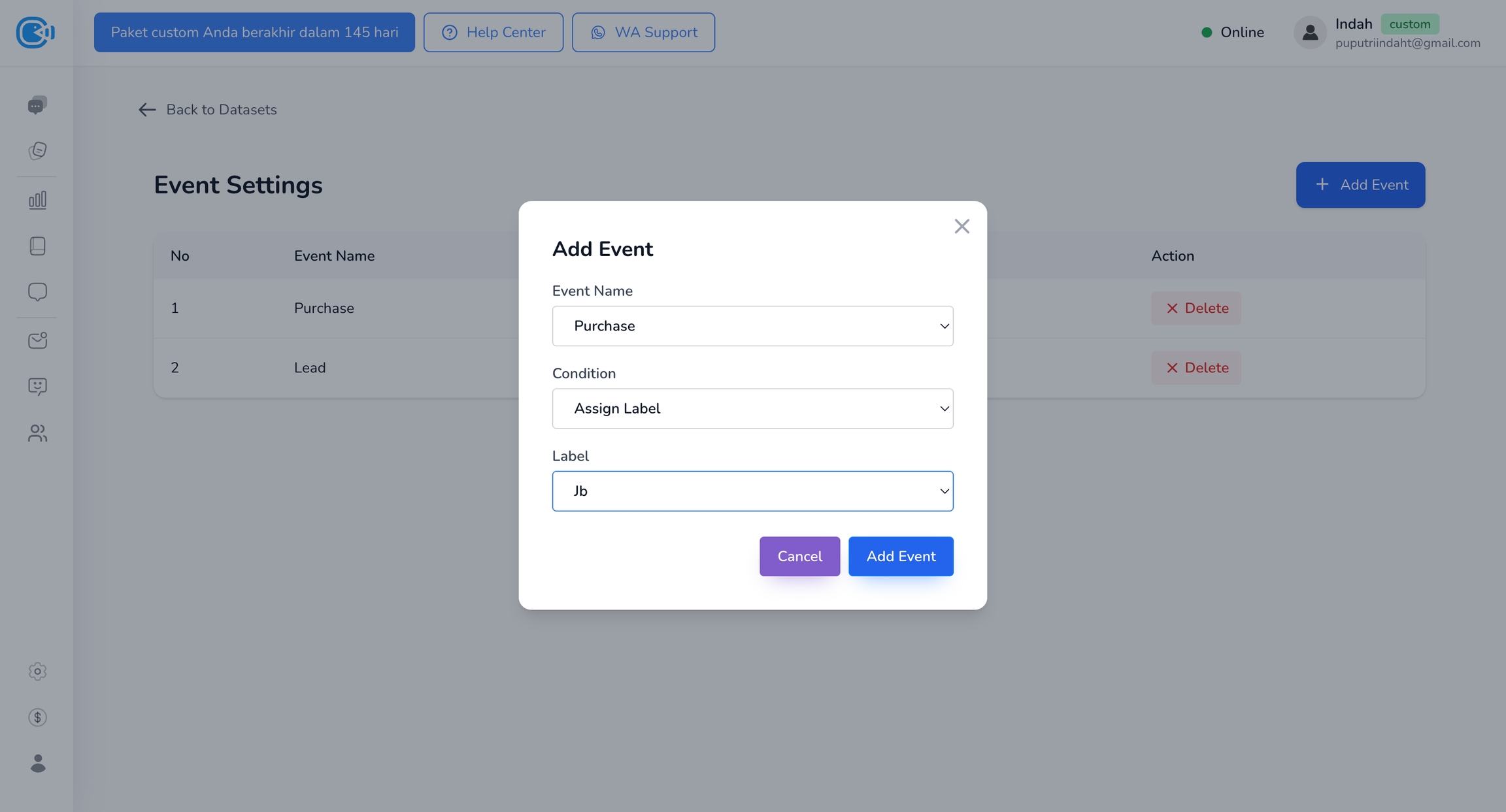 Saat sedang di halaman Conversation, Kamu bisa menambahkan label yang sudah dihubungkan dengan Meta Event.