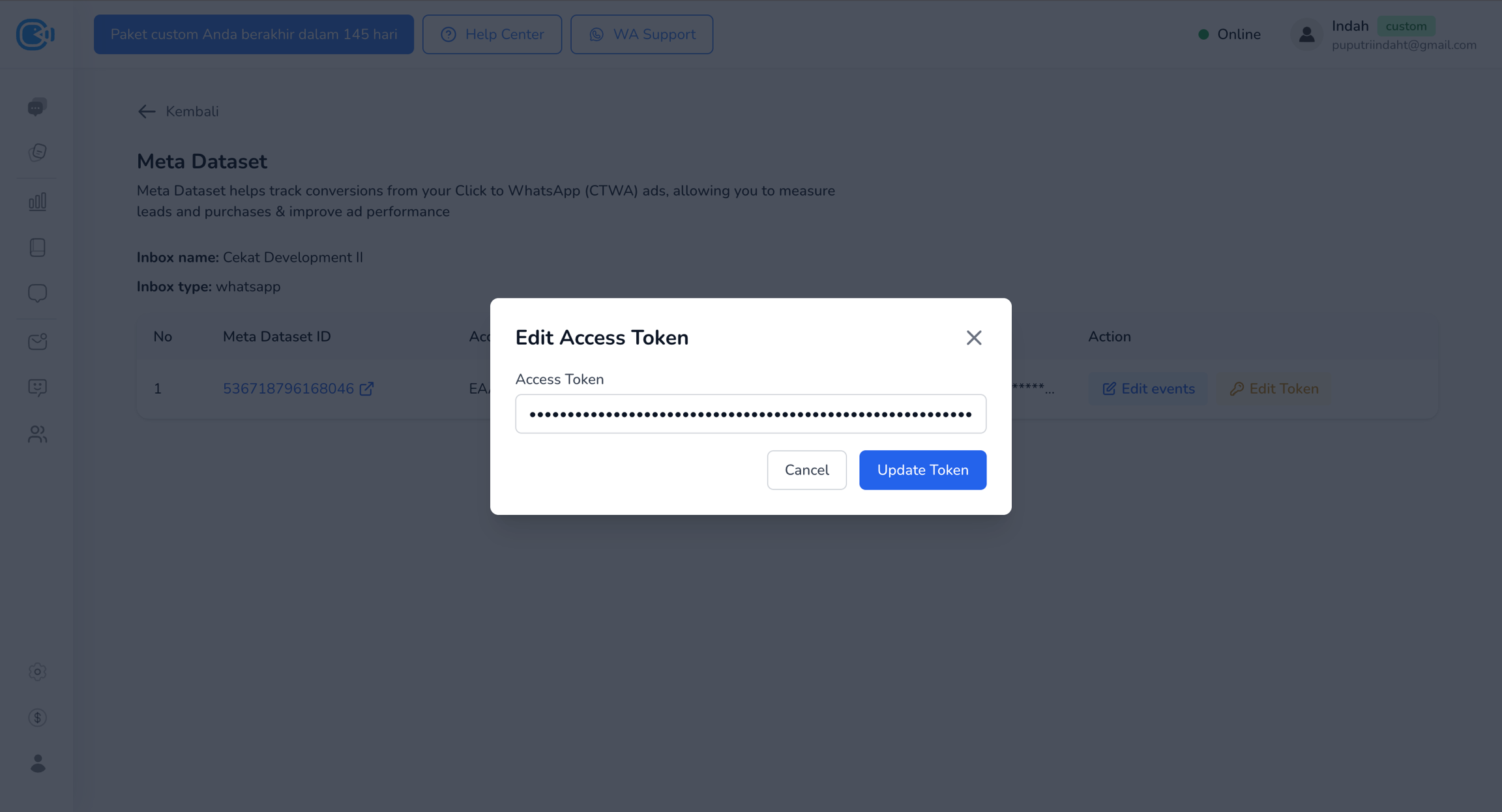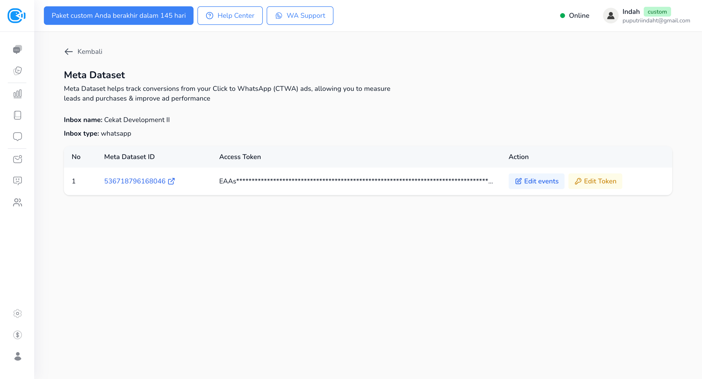 Kembali ke halaman Meta Dataset di Cekat, klik tombol Edit Token.