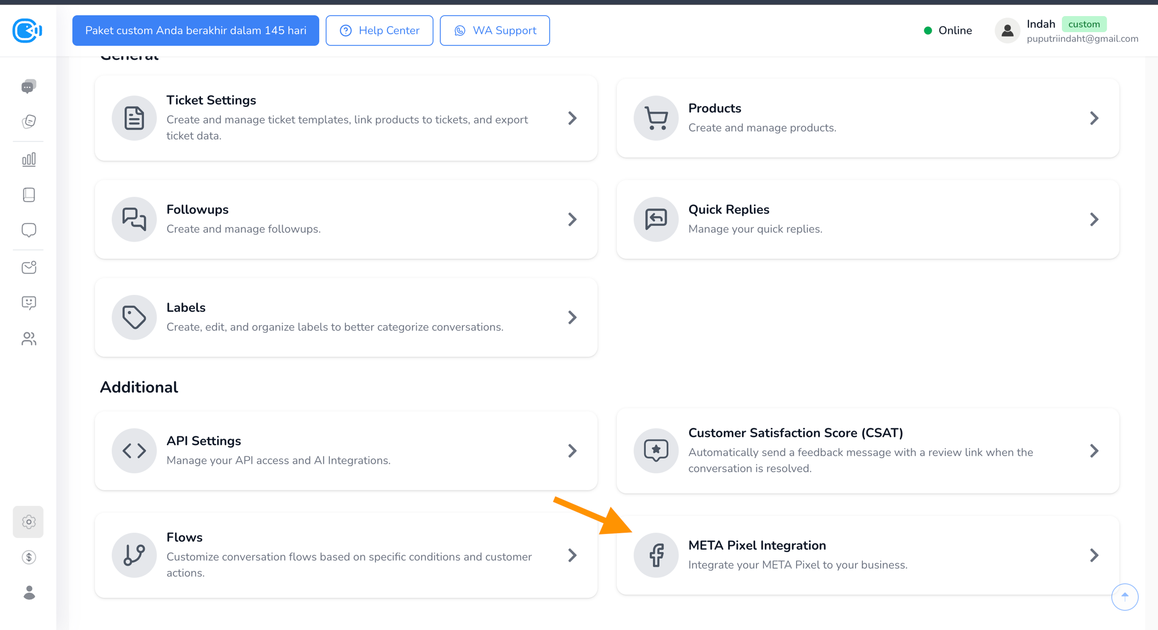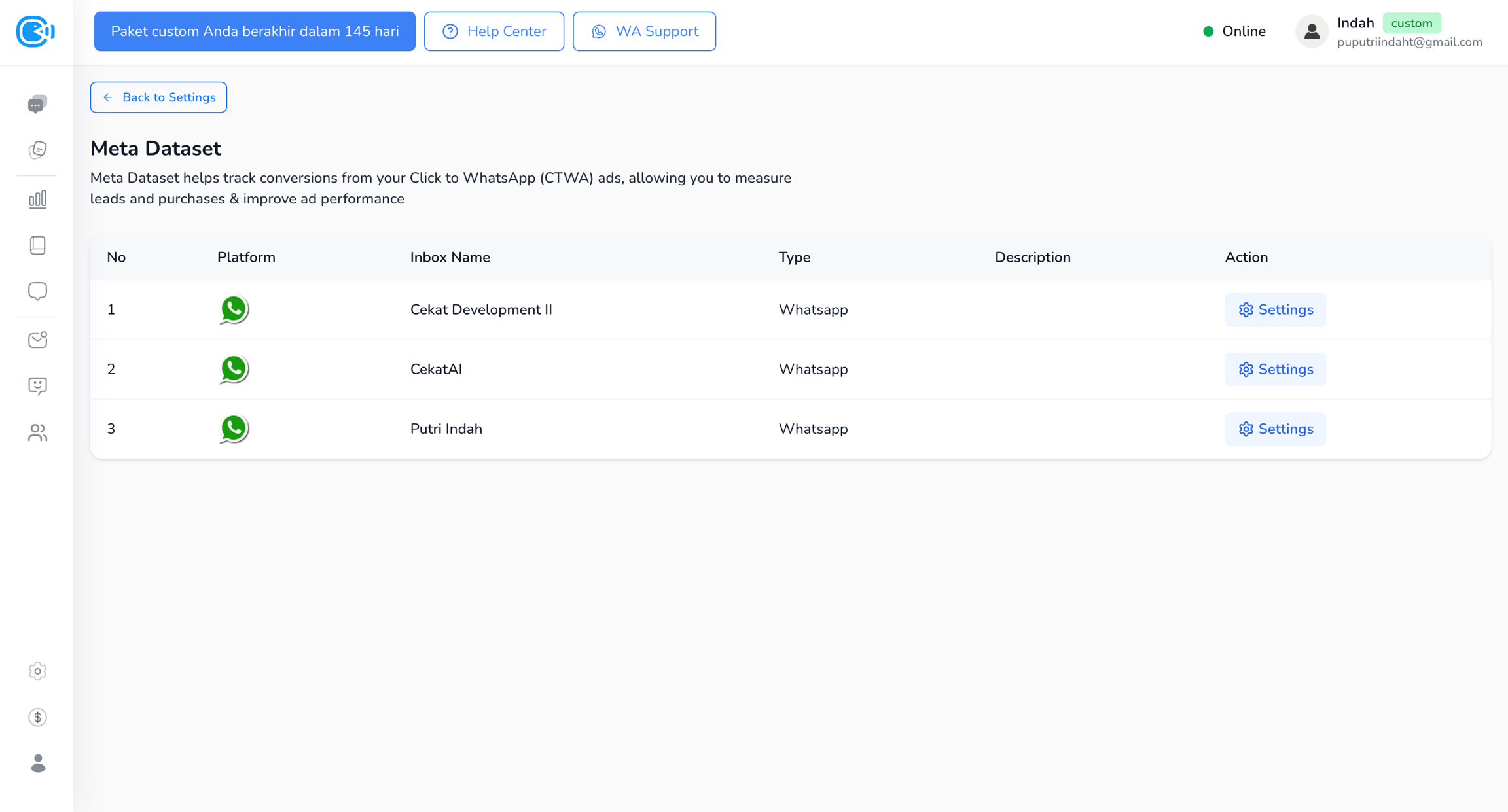 Pilih inbox WhatsApp yang ingin Kamu integrasikan, lalu klik Setting.