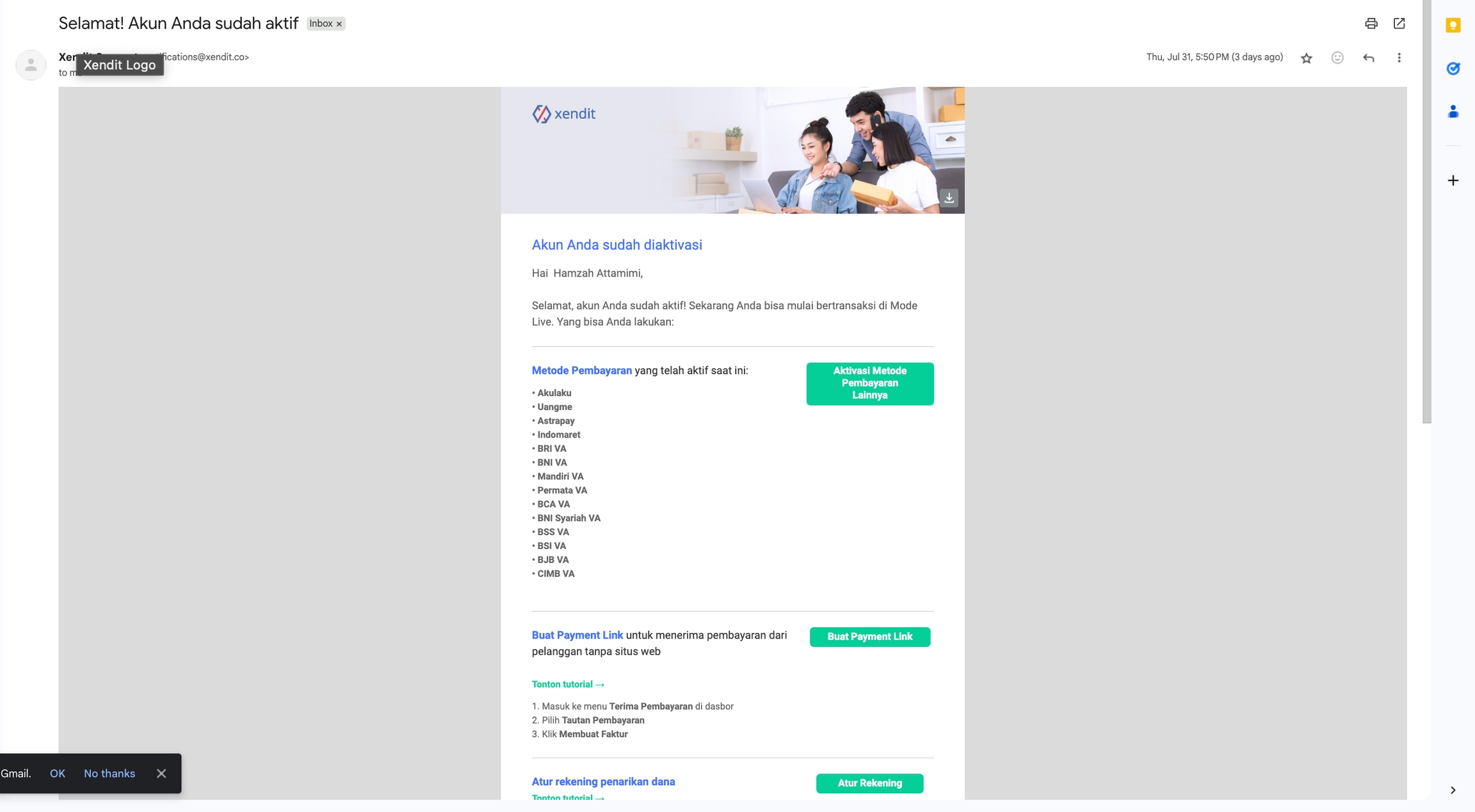 Proses aktivasi Xendit akan berlangsung 1–3 hari kerja