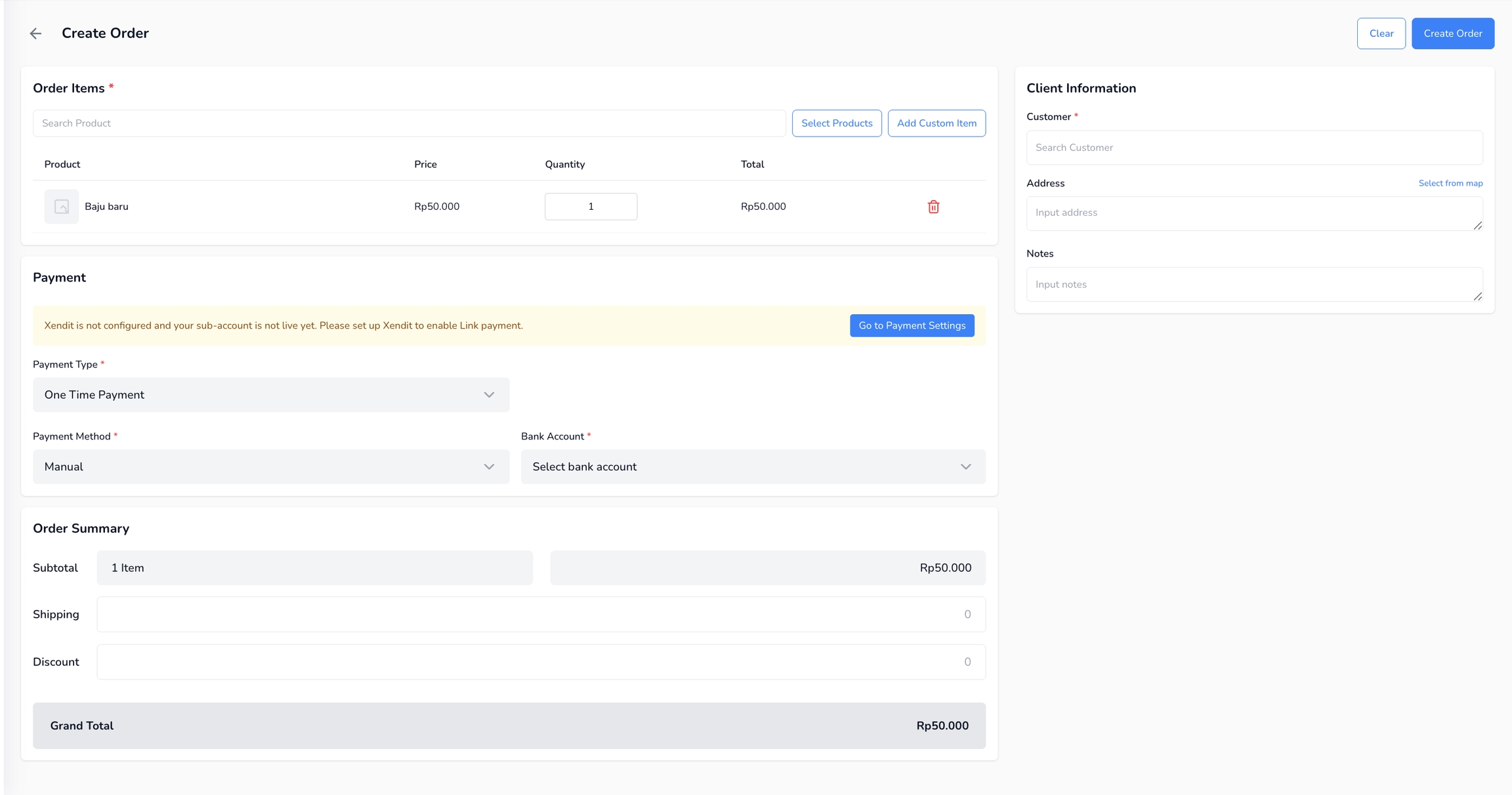Di halaman Create Order, kamu akan melihat beberapa bagian utama