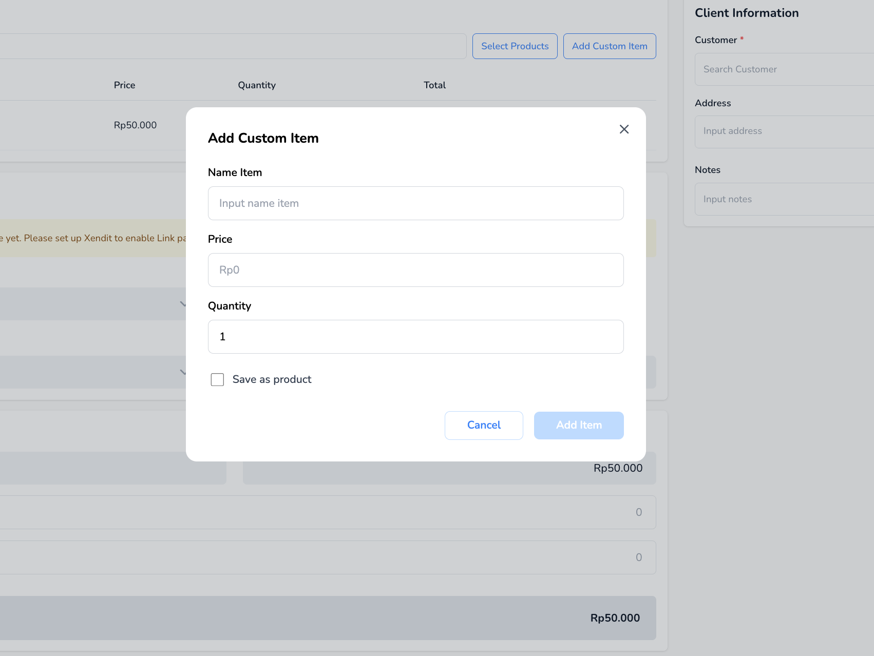 Add Custom Item: digunakan untuk menambahkan item baru yang belum ada. Isi nama item dan harga, lalu klik Add Item.