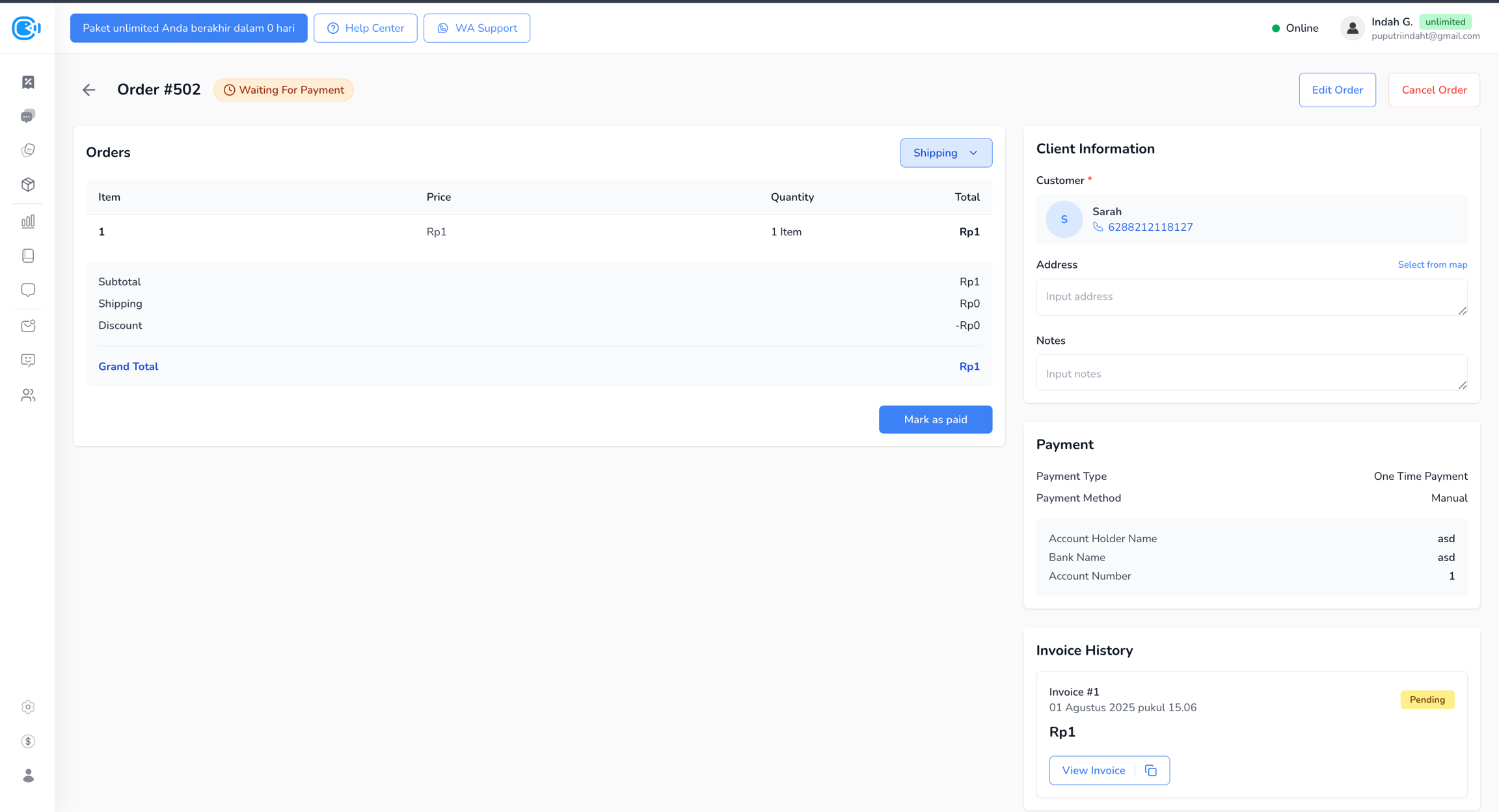 Kamu bisa klik tombol Edit Order selama status pembayaran masih belum “Paid”