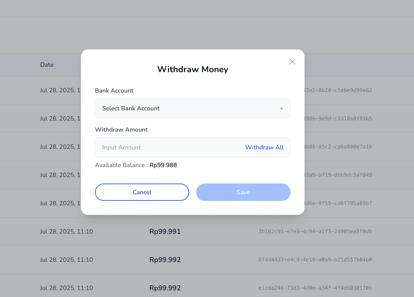 Setelah diklik, akan muncul popup Withdraw Money