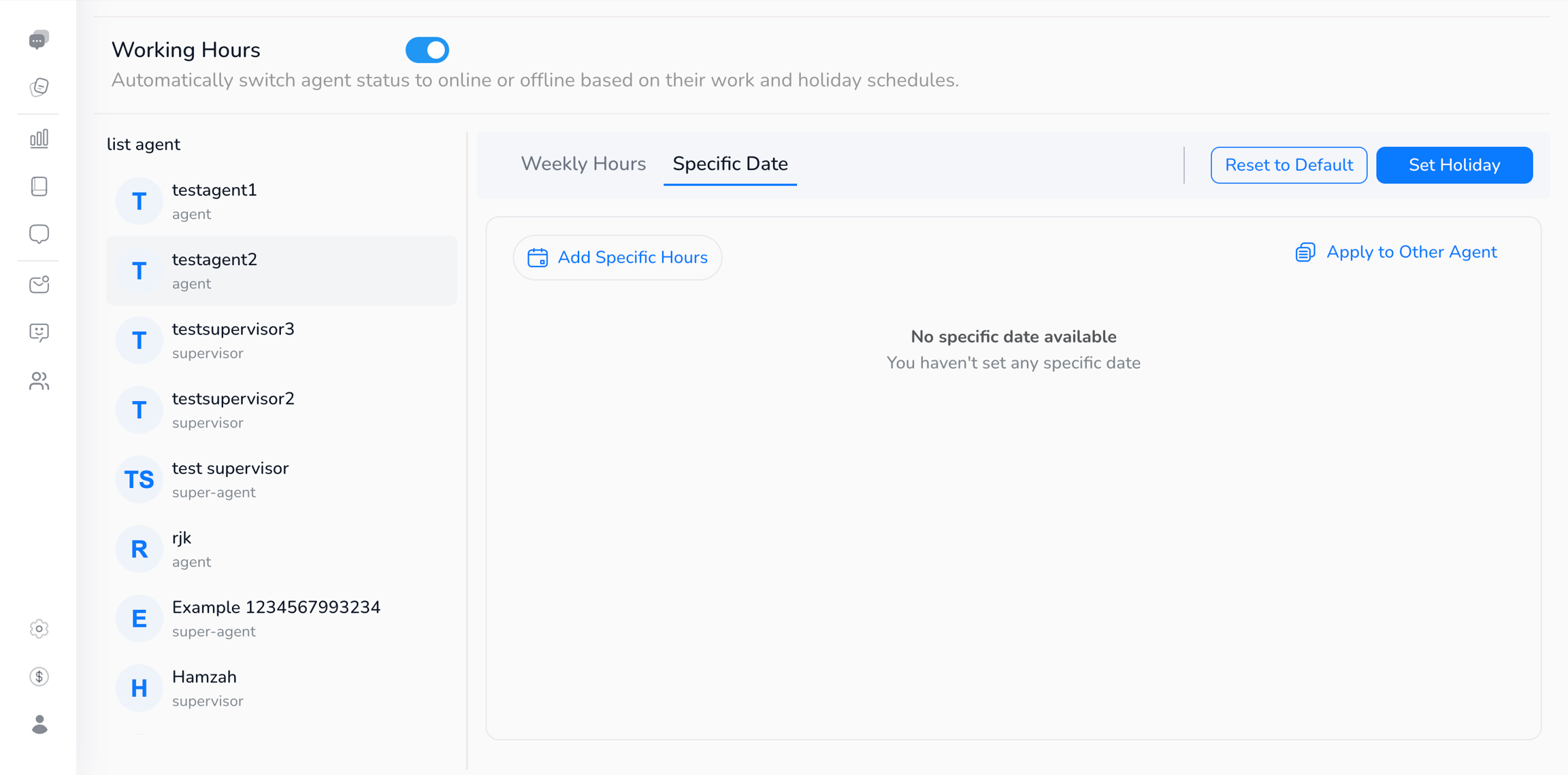 Fitur ini memungkinkan status agen berubah otomatis menjadi online atau offline berdasarkan jam kerja dan jadwal libur yang telah ditentukan.
