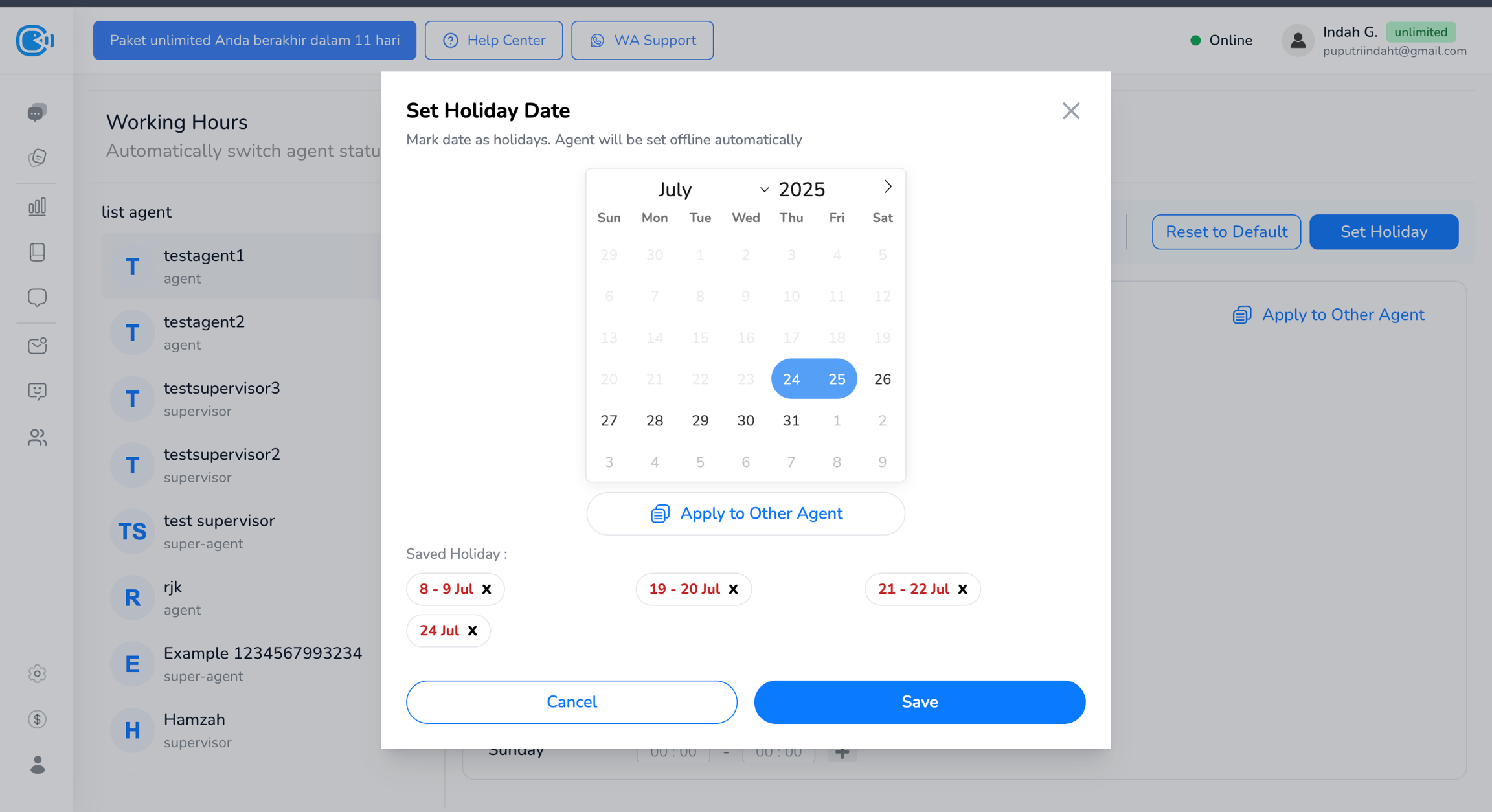 Menandai tanggal sebagai hari libur. Tanggal libur akan menimpa pengaturan jam kerja mingguan dan agent akan otomatis offline.