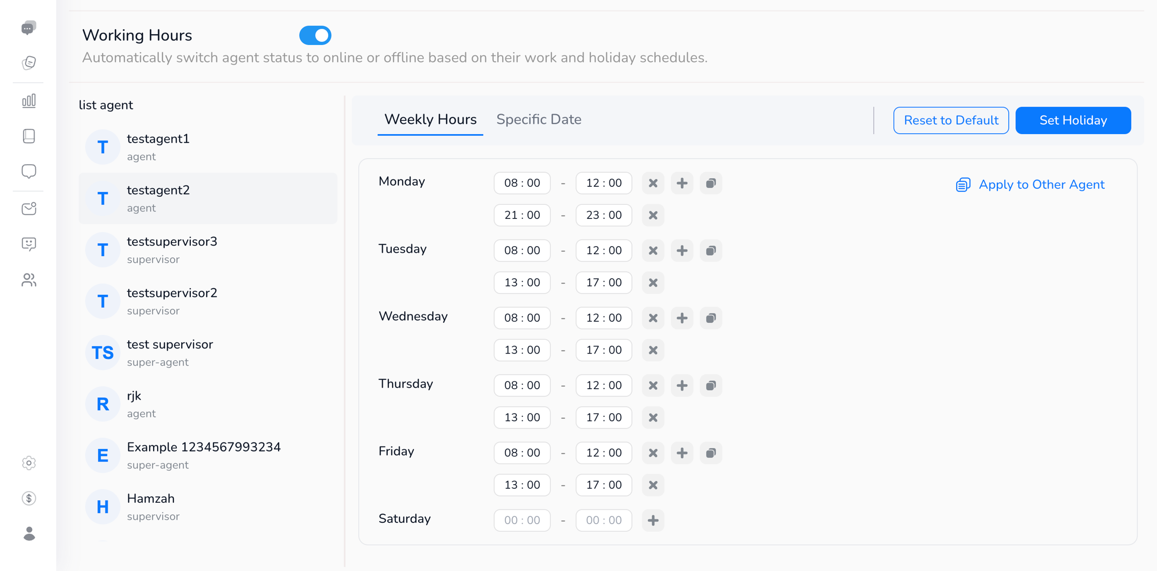 Setelah selesai mengatur satu agen, kamu dapat mengcopynya ke agent lain jika memiliki hari kerja yang sama dengan klik buttin Apply to Other Agent dan pilih agent yang kamu butuhkan.