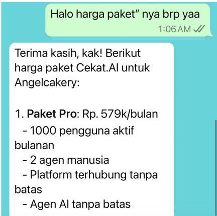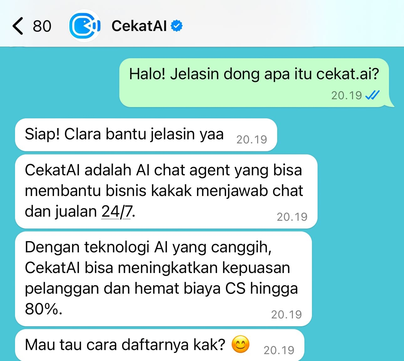 AI Agent kami bisa melayani pelanggan anda 24/7, menghemat waktu, biaya Customer Service, dan membantu Anda melayani puluhan ribu pelanggan dalam satu waktu.