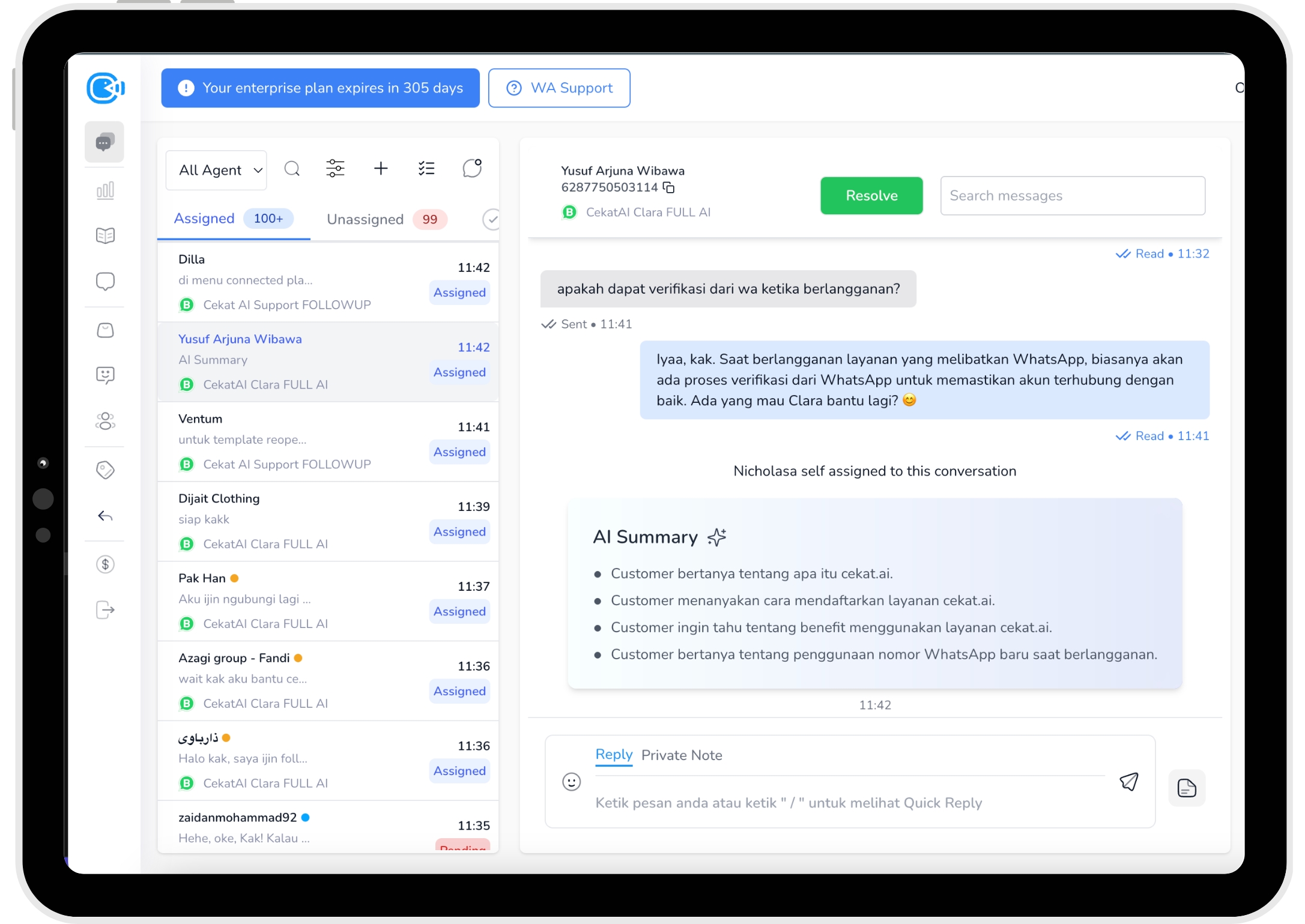 CekatAI adalah AI Agent builder dan Omnichannel CRM yang membantu anda membalas chat pelanggan dari semua channel seperti WhatsApp, IG, FB, dan Marketplace dengan AI yang menjawab seperti manusia.