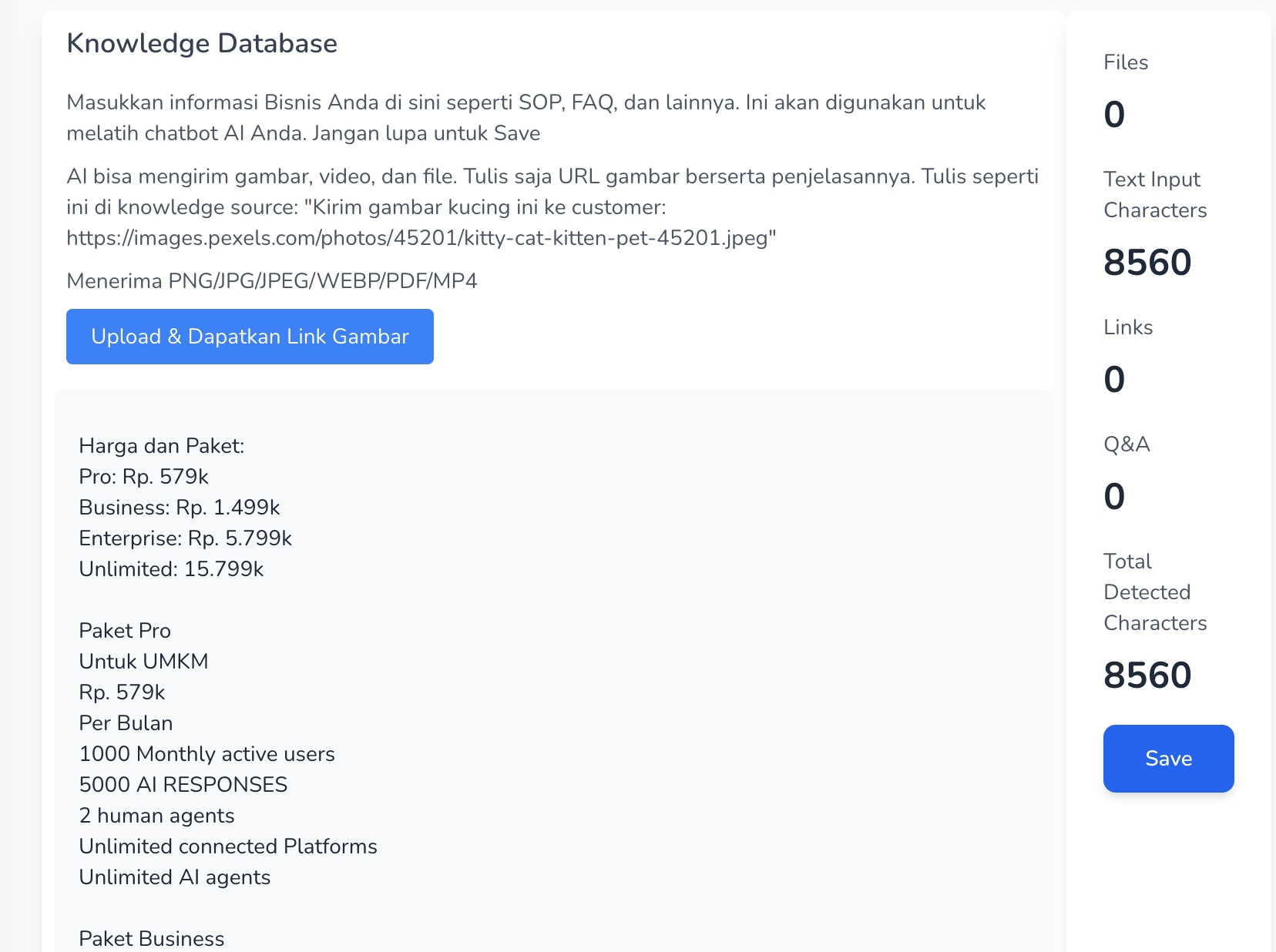 Masukkan informasi bisnis Anda di sini, seperti SOP, FAQ, dan lainnya. Ini akan digunakan untuk melatih chatbot AI Anda.