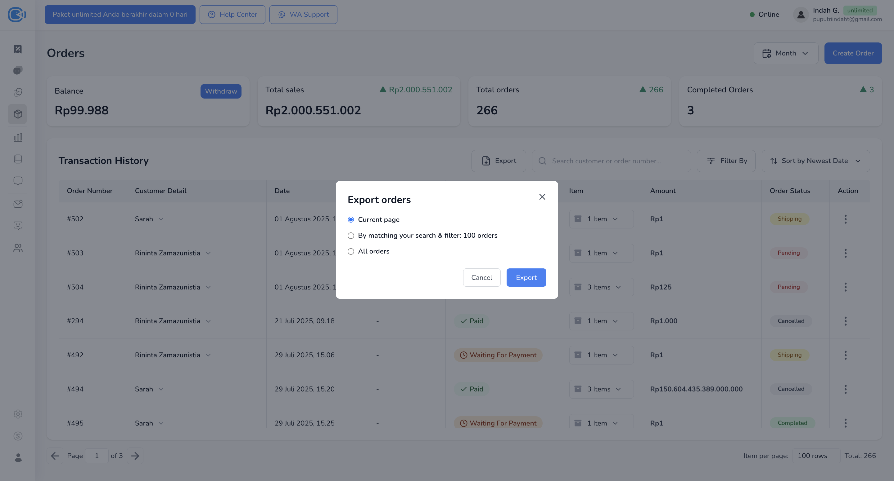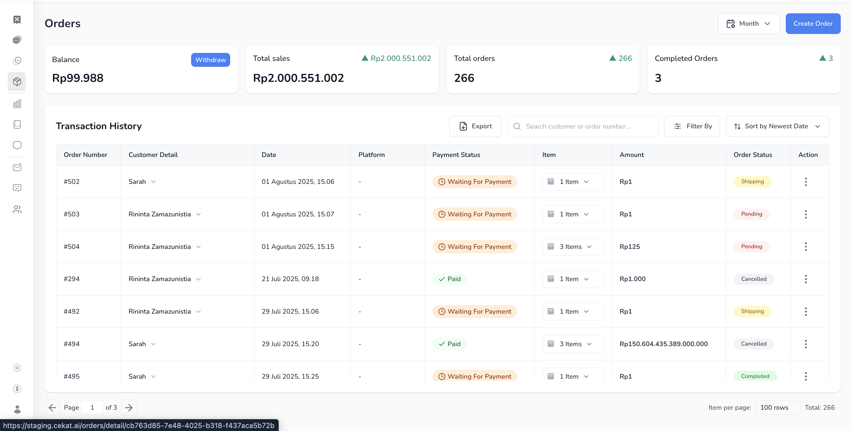 * **Payment Status**: status pembayaran seperti *Waiting for Payment*, *Paid, pending*